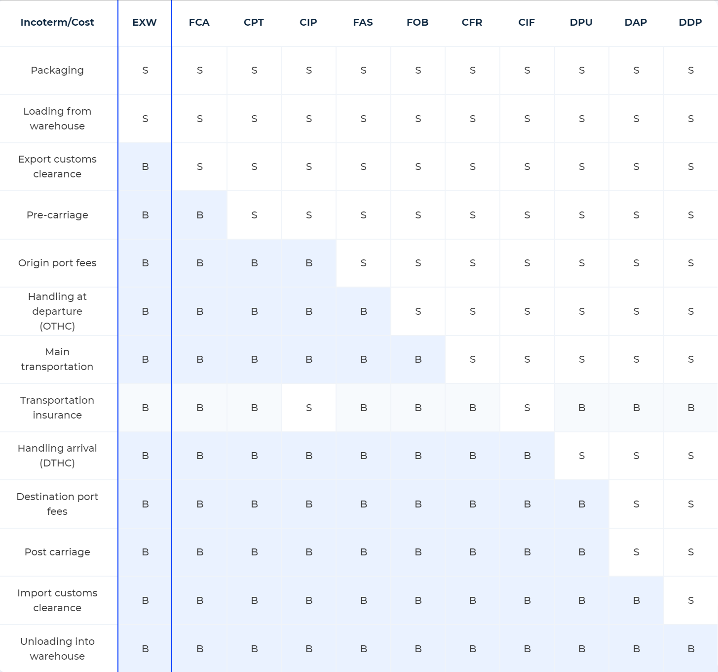 Distribution of costs according to the Incoterm negotiated in the contract. Classification according to the increased level of obligations for the seller.