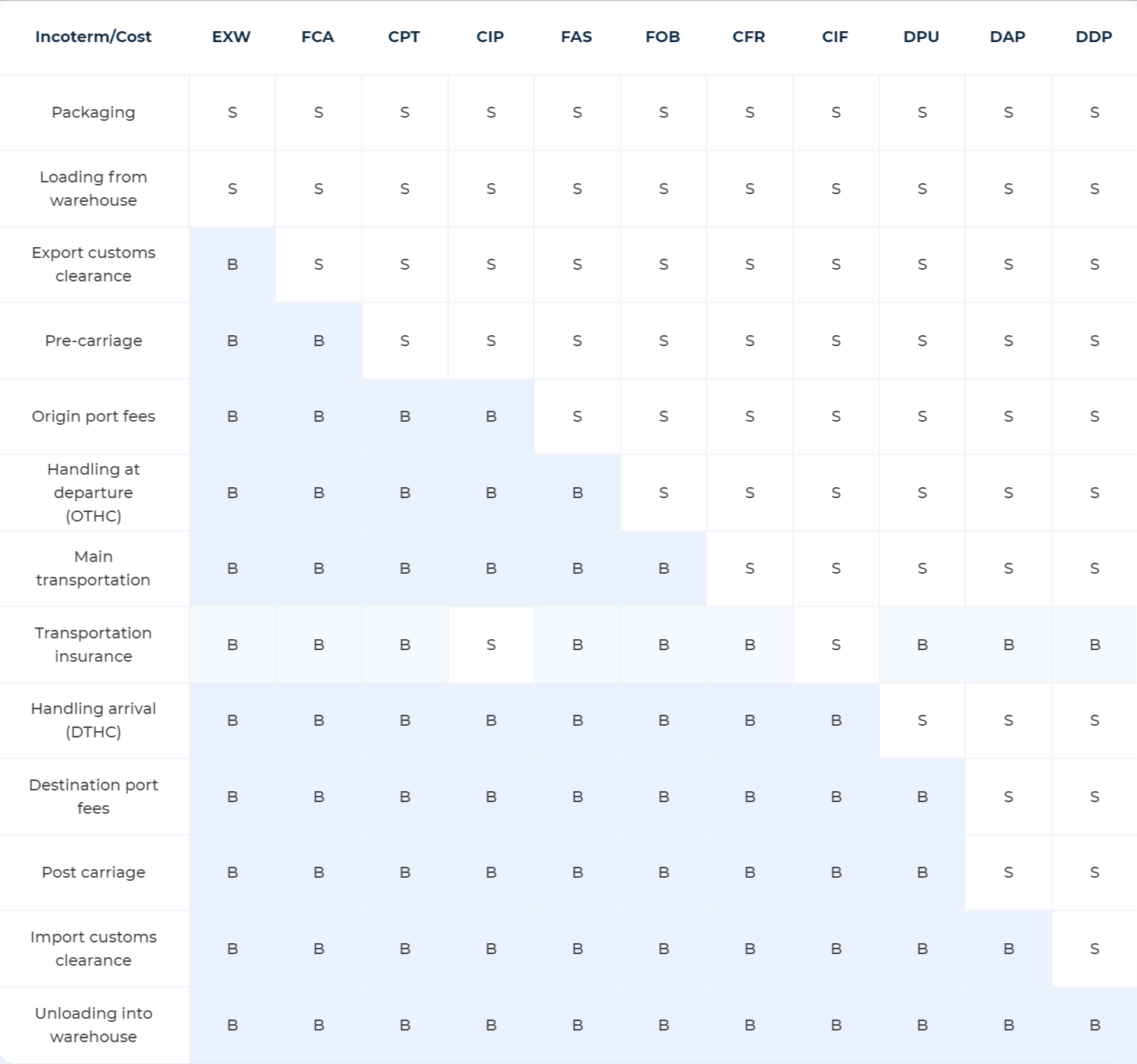 Distribution of costs according to the Incoterm negotiated in the contract. Classification according to the increased level of obligations for the seller.