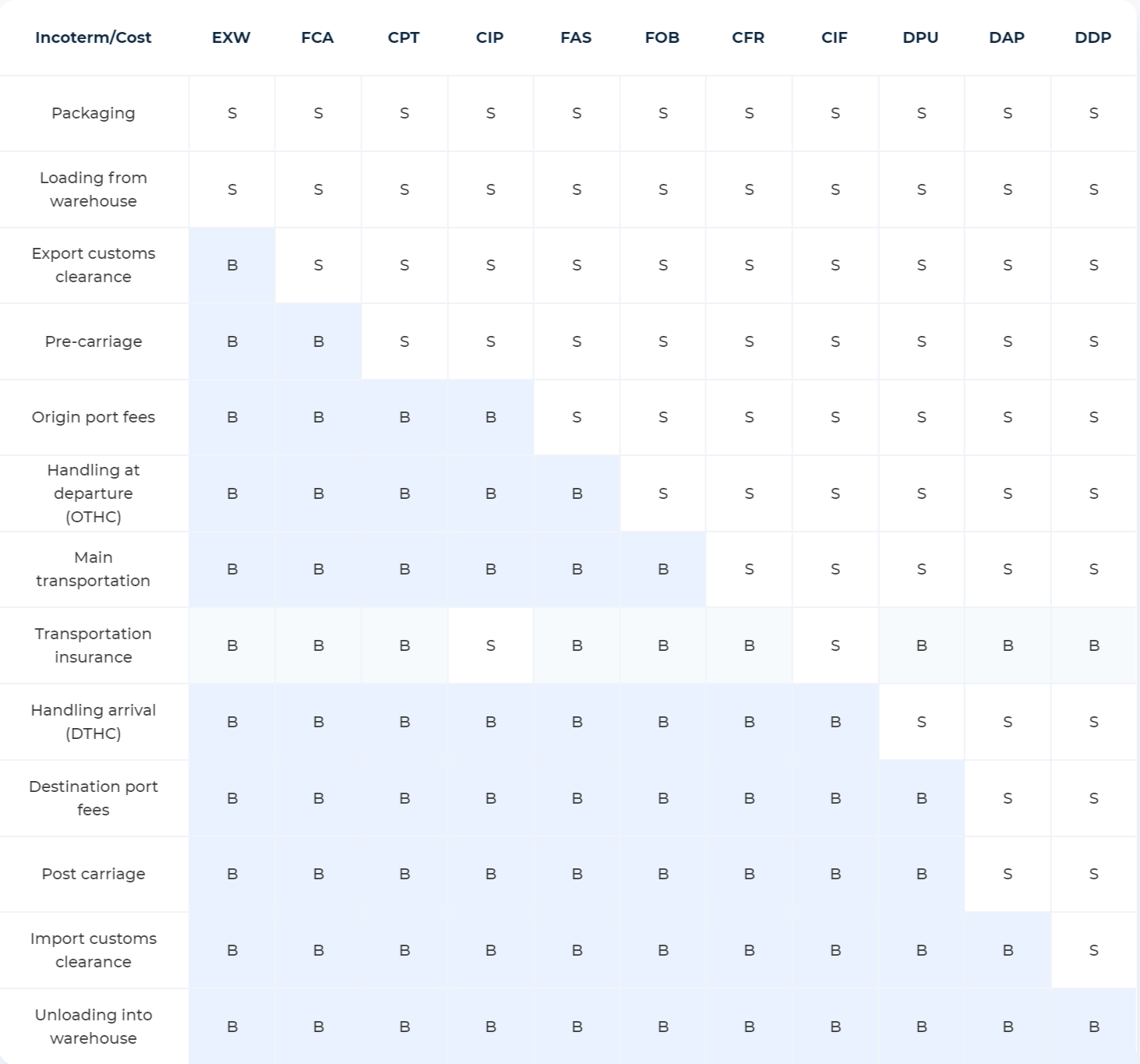 Distribution of costs according to the Incoterm negotiated in the contract. Classification according to the increased level of obligations for the seller.