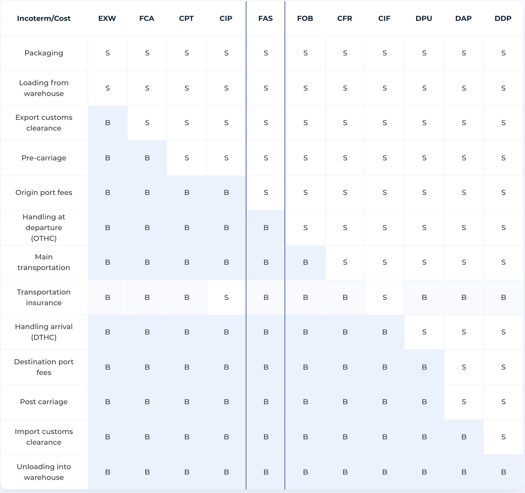 Distribution of costs according to the Incoterm negotiated in the contract. Classification according to the increased level of obligations for the seller.