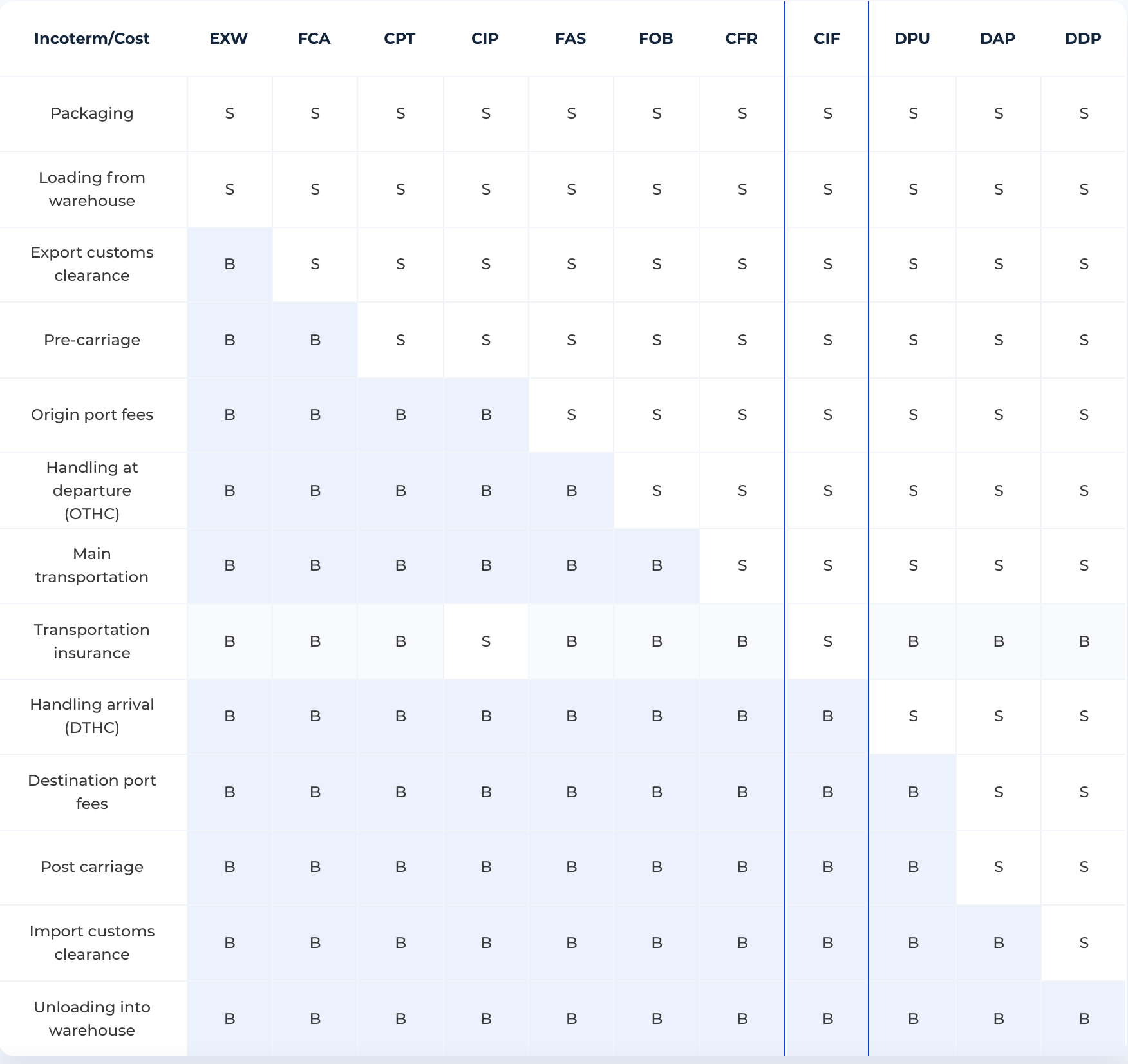 Distribution of costs according to the Incoterm negotiated in the contract. Classification according to the increased level of obligations for the seller.