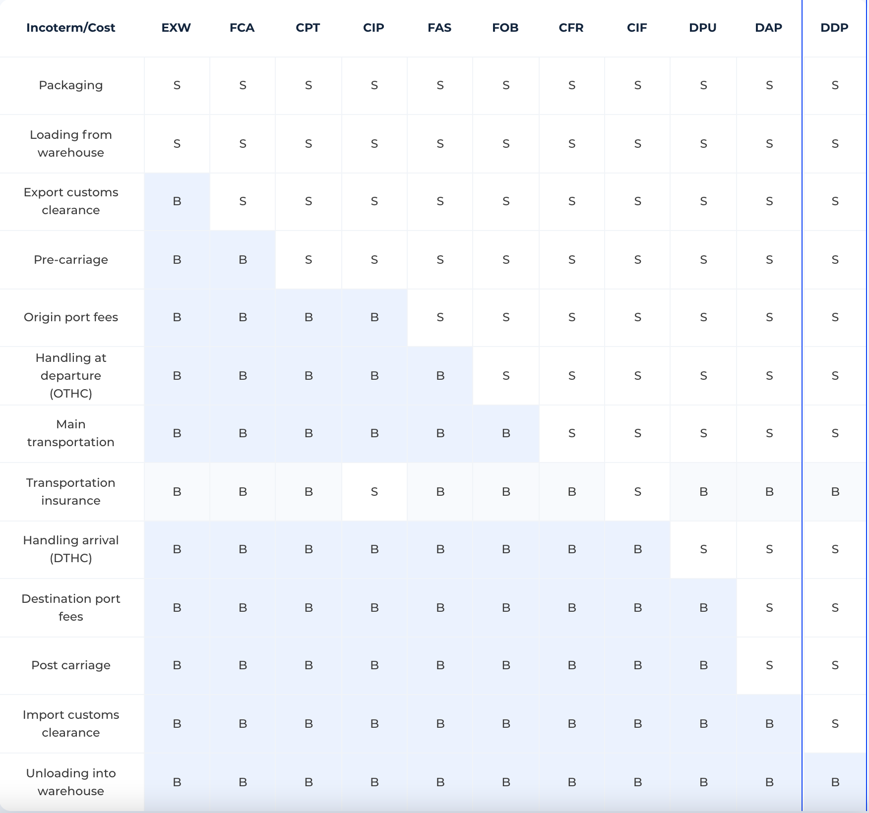 Distribution of costs according to the Incoterm negotiated in the contract. Classification according to the increased level of obligations for the seller.