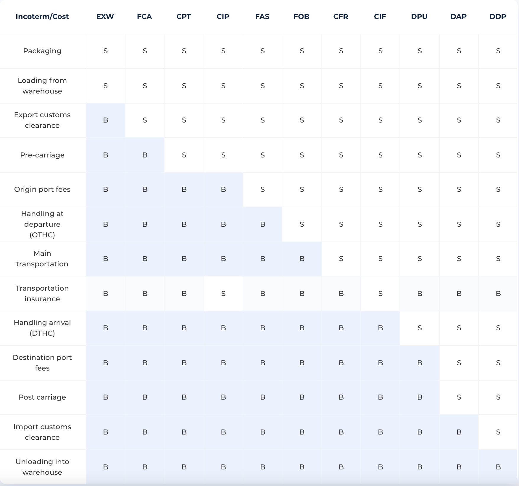 Distribution of costs according to the Incoterm negotiated in the contract. Classification according to the increased level of obligations for the seller.
